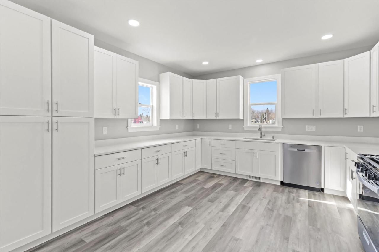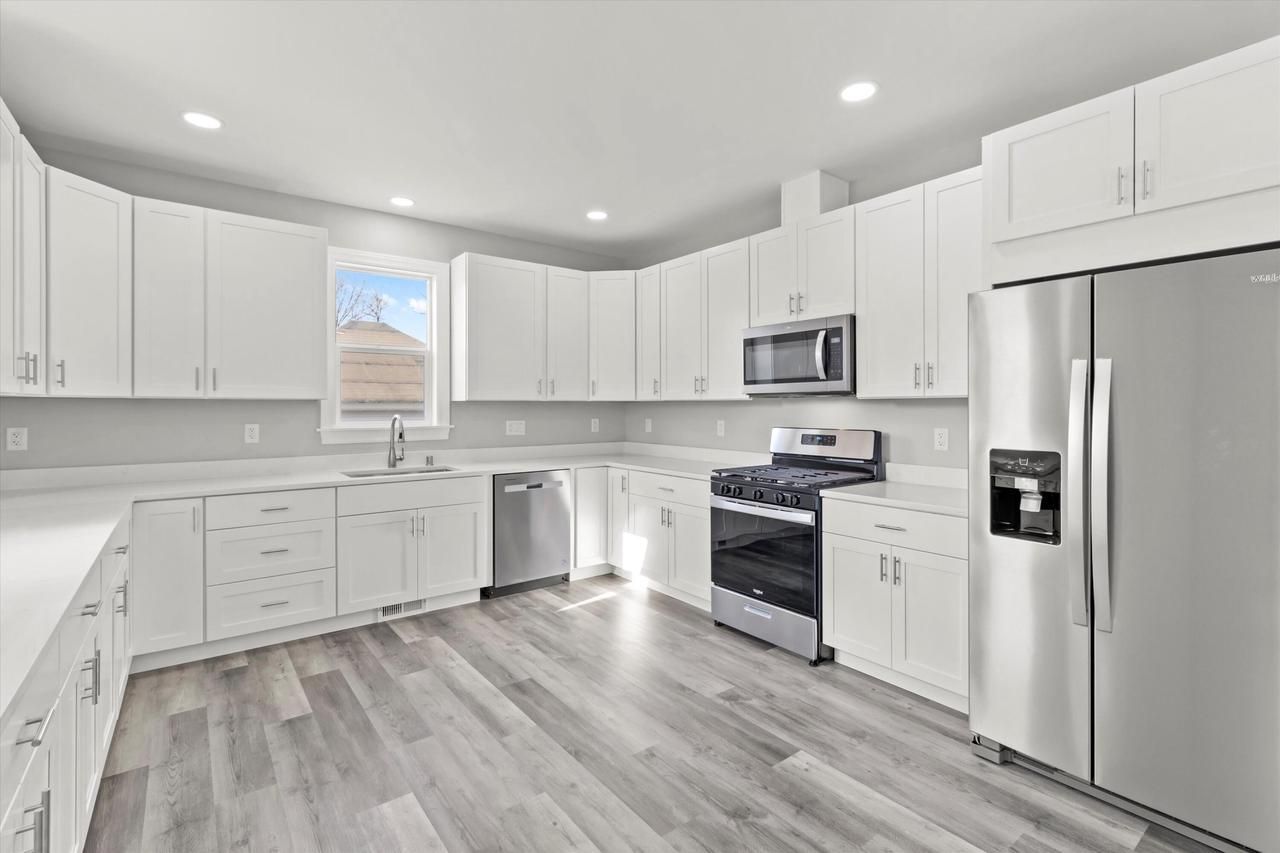 Welcome to this beautifully remodeled 3 bed, 2.5 bath home that's over 2,100 sq. ft. Completely gutted to the studs and rebuilt with today's buyer in mind, including brand-new electrical, plumbing, insulation, drywall, flooring, lighting, kitchen, baths & more! Open and bright main floor featuring a spacious living rm, dining area, and stunning chef's kitchen with quartz countertops, white 42 in cabinets, stainless steel appliances, and tons of storage. 3 enclosed porch spaces. The main level also includes a convenient first-floor bedroom, a beautifully updated full bath with modern tile finishes. Upstairs - 2 bedrooms and a second updated full bathroom. Located on a large corner lot and a detached garage. This one is theone you've been waiting for, make it yours!