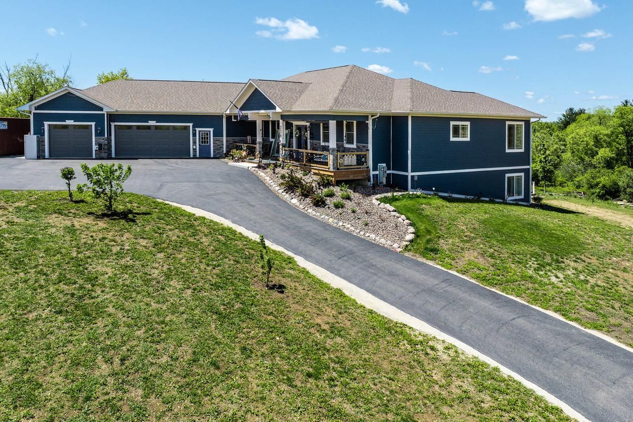 If you have looked into new construction, you know you could not build this much house for this price. Custom built in 2023 on 5.5 acres using ICF (insulated concrete forms) construction for exceptional strength and efficiency. Open-concept design with 10' coffered ceilings and a chef's kitchen featuring a pantry, three ovens, two dishwashers, and double islands. Enjoy elevated countryside views from the four-season room, covered front porch, and huge maintenance-free rear deck. Two main-level en-suites plus office/5th bedroom. Dream garage is 1,400 sq ft w/radiant heated floors. Walkout lower level with heated floors, 2 bedrooms, den, office, laundry, and garage space. Whole home generator. Paved circular driveway. Just minutes to Lake Geneva.