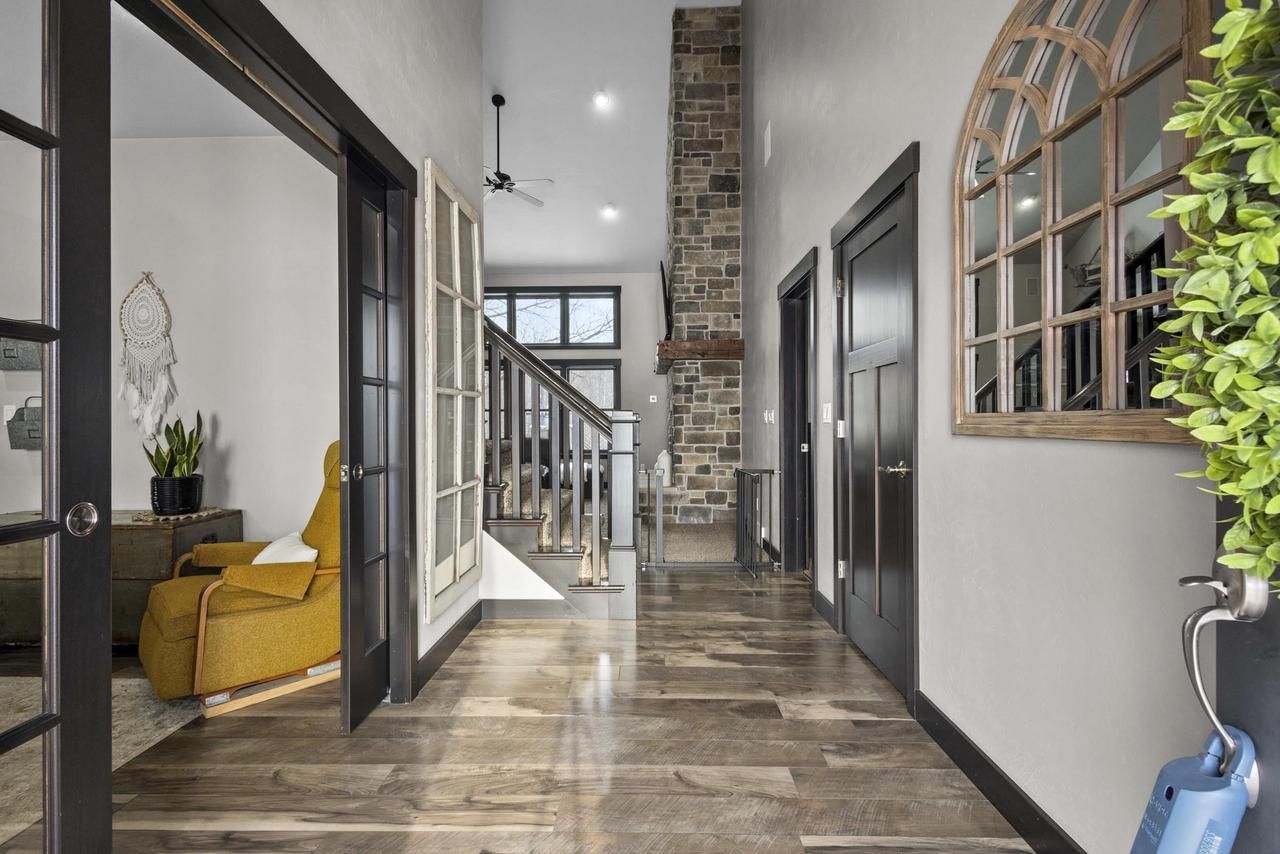 Stunning 1.5-story home on a private, wooded 3.467-acre lot with a scenic ravine. Thoughtfully designed with great flow, large foyer and private office with French doors. Main living area features a dramatic floor-to-ceiling stone FP & tons of natural light. The kitchen offers granite countertops, center island with seating, walk-in pantry & patio drs leading to a spacious deck w/ pillars,steel railing overlooking the serene setting w/ stairs to the patio & hot tub. The main-level primary suite includes radiant in-floor heat, double vanity, tiled shower, and walk-in closet. Upper level boasts 3 bdrms, bathroom & landing area/study space. Newly finished lower level features a full wet bar, quartz counters, tray ceilings & rec rm. Heated 3-stall garage with lower-level access & so much more!