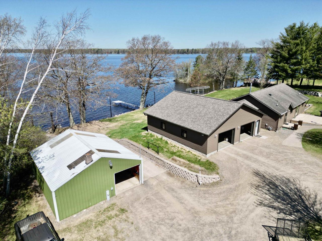 Western frontage on 3585 acre Pelican Lake with a private boat landing, 3 BR 3 bath home , multiple outbuildings, and direct access to both the snowmobile and ATV trails. The 2.45 acre lot has a large hill at the road that provides a complete buffer from the highway, a 36X63 Heated Pole building workshop, with 24X54 Storage shed, & detached 2 car garage. The attached garage has been completely finished as a great room so it can be used as a bunk room with a wet bar, or still use it as a garage when guests aren't around. The kitchen has gorgeous oak cabinets and a breakfast bar that flows into the living room with stone gas fireplace, vaulted ceilings, & patio door to the 40'X14' lakeside deck. With multiple driveways and easy access it's the perfect location for a home or business.