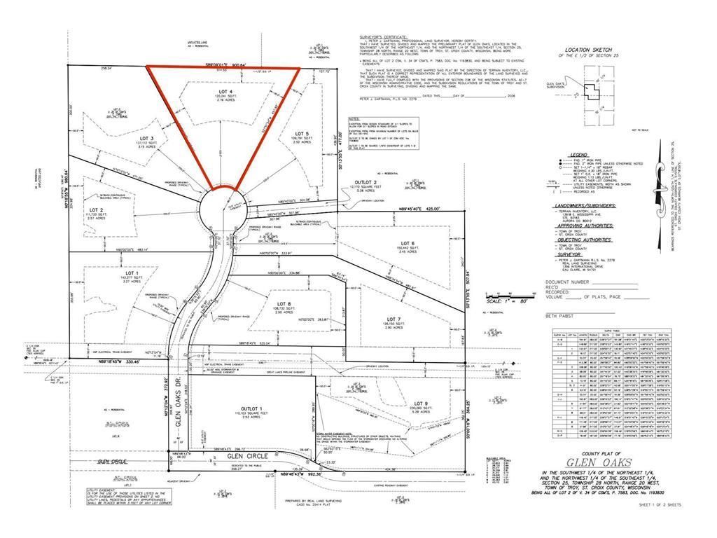 Introducing Glen Oaks, the newest development in Troy Township?where privacy, nature, and space come together in a truly special setting. Nestled among mature trees and gently rolling landscape, Glen Oaks offers a rare opportunity to build your dream home on expansive homesites ranging from 2.5 to over 5 acres. These beautiful lots are thoughtfully positioned to provide a tucked-away feel while still offering convenient access to nearby amenities. Whether you envision a modern farmhouse, a custom rambler, or a private estate retreat, Glen Oaks gives you the space and flexibility to bring your vision to life. Please note that lot outlines are approximate. Survey markers will be placed to clearly identify boundaries. The current driveway serving the existing home will be removed once the new road is constructed this spring.