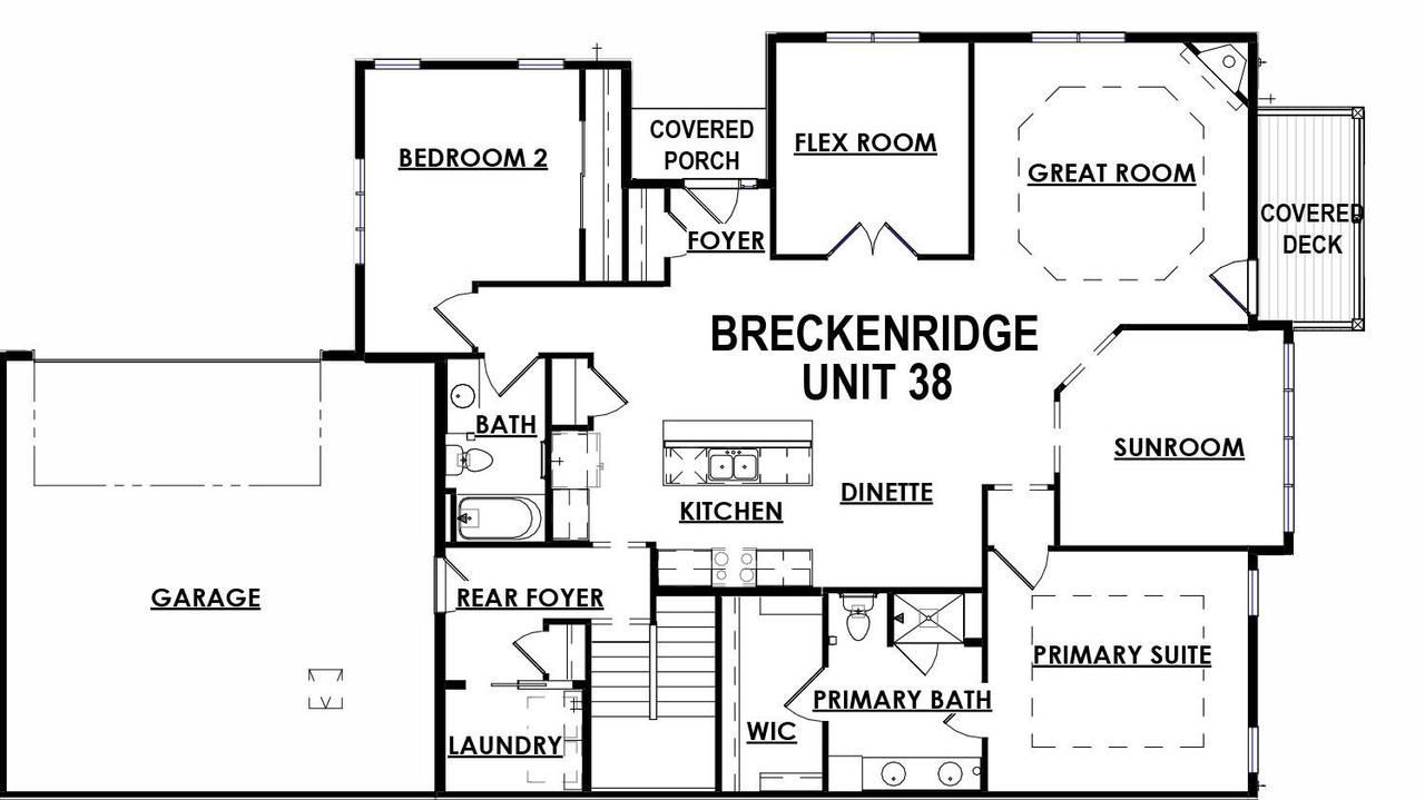 Bld 14 - Unit 38 - Breckenridge Floorplan NEW CONSTRUCTION - READY Late July 2026! Ranch condominium featuring an open concept with 9' ceilings throughout. A perfect layout for entertaining with a spacious Kitchen and Dinette that opens up into the Great Room - with a gas fireplace -Flex Room and Sunroom. The Primary Suite includes an oversized WIC, ceramic tiled shower and double bowl vanity. This home also includes a private entry, covered deck and 2-car attached Garage. A spacious unfinished basement with an egress window and full bath rough in leaves plenty of room for future expansion.