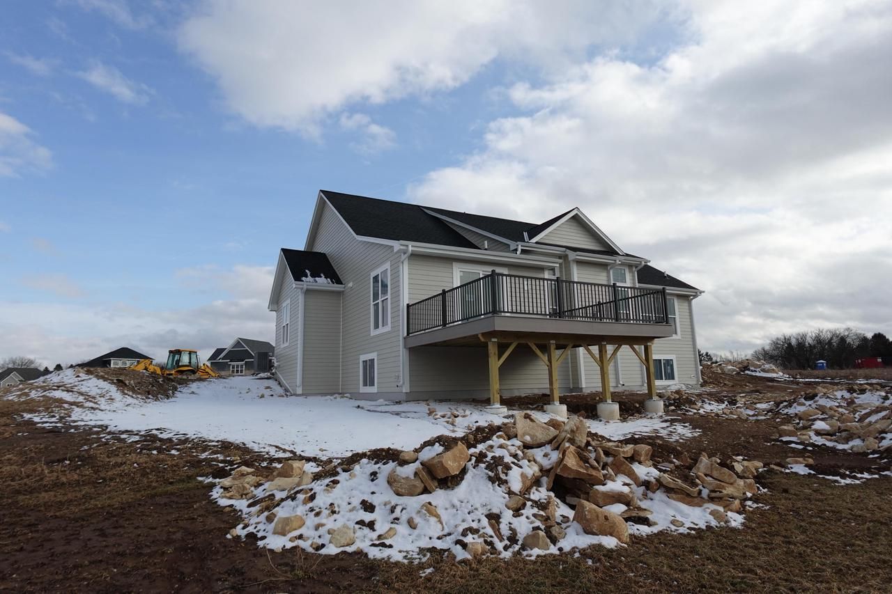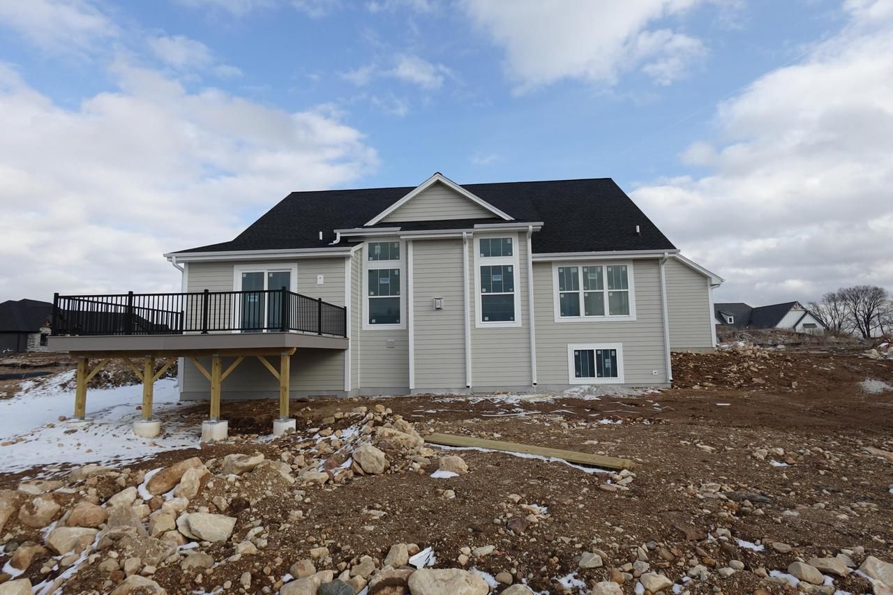 HOUSE IS BEING DRYWALLED. 4 bedrooms (flex room or 4th bedroom)/2.5 baths/Elite series/partial exposure/composite deck/split ranch design. Basement has drain/vent rough-in for future full bath & windows in exposure. Ceramic tiled shower w/2 shower heads/double sinks in master. Double sinks family bath. Huge WIC master suite. 9' main floor ceilings: pitched ceiling in living room/tray ceiling in master bedroom. Boxed tray ceiling in kitchen/wide millwork/paneled doors. Elite series kitchen cabinets are staggered w/cabinet crown moulding/cabinet hardware/backsplash/island with sink/spacious pantry closet. Main floor laundry/mudroom w/drywall lockers, closet, cabinets with sink. Covered front porch w/box posts. Hardi-plank siding. 3-car garage with large storage area (14'7'' x 16'9'